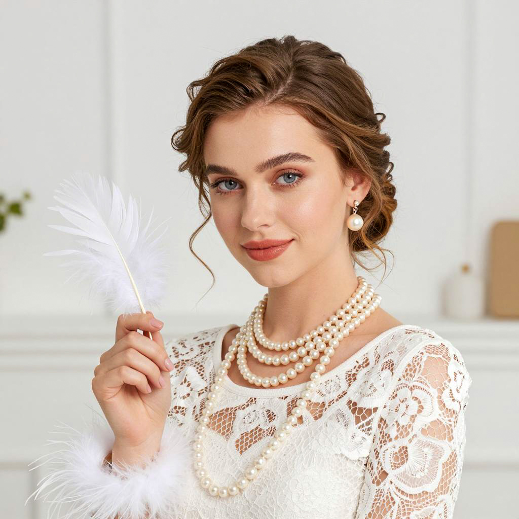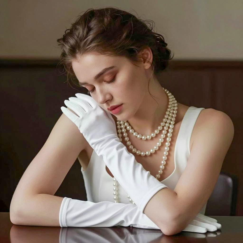 Woman with light skin, brown hair in an updo, wearing white lace bra, pearl necklace, and white fur stole, leaning forward. Candle candelabra with four lit candles on left. Vintage room with green walls, arched window, and ornate trim. Woman's eyes closed, lips slightly parted, expression intense. Three-layer pearl necklace. Golden earrings. Dim, warm lighting. Classic, elegant style.