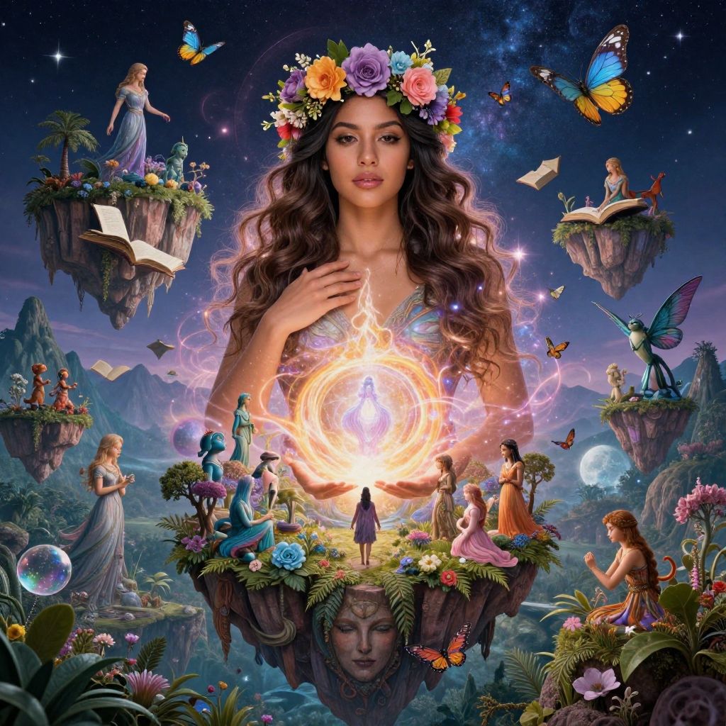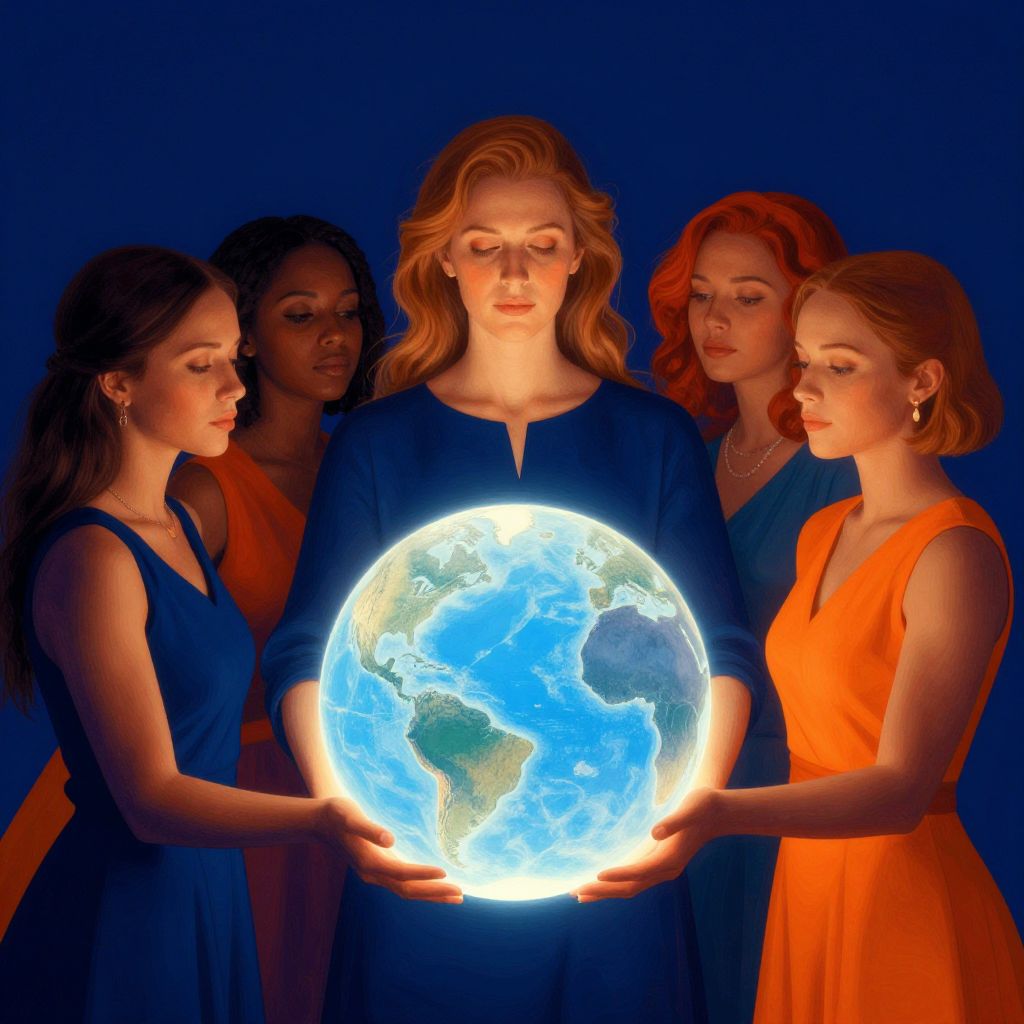 Photograph of five women with diverse skin tones and hair colors, standing closely in a dark blue background. The central woman, with wavy blonde hair and glasses, wears a blue dress and holds a glowing, illuminated Earth globe. Four women, dressed in blue and orange dresses, surround her, gazing at the globe with serene expressions. The glowing Earth is brightly lit, contrasting with the dark background and the women's dresses. The image has a surreal, almost magical quality, emphasizing unity and global connection.