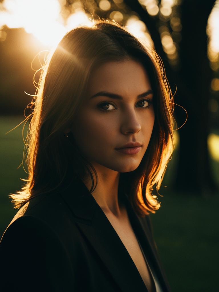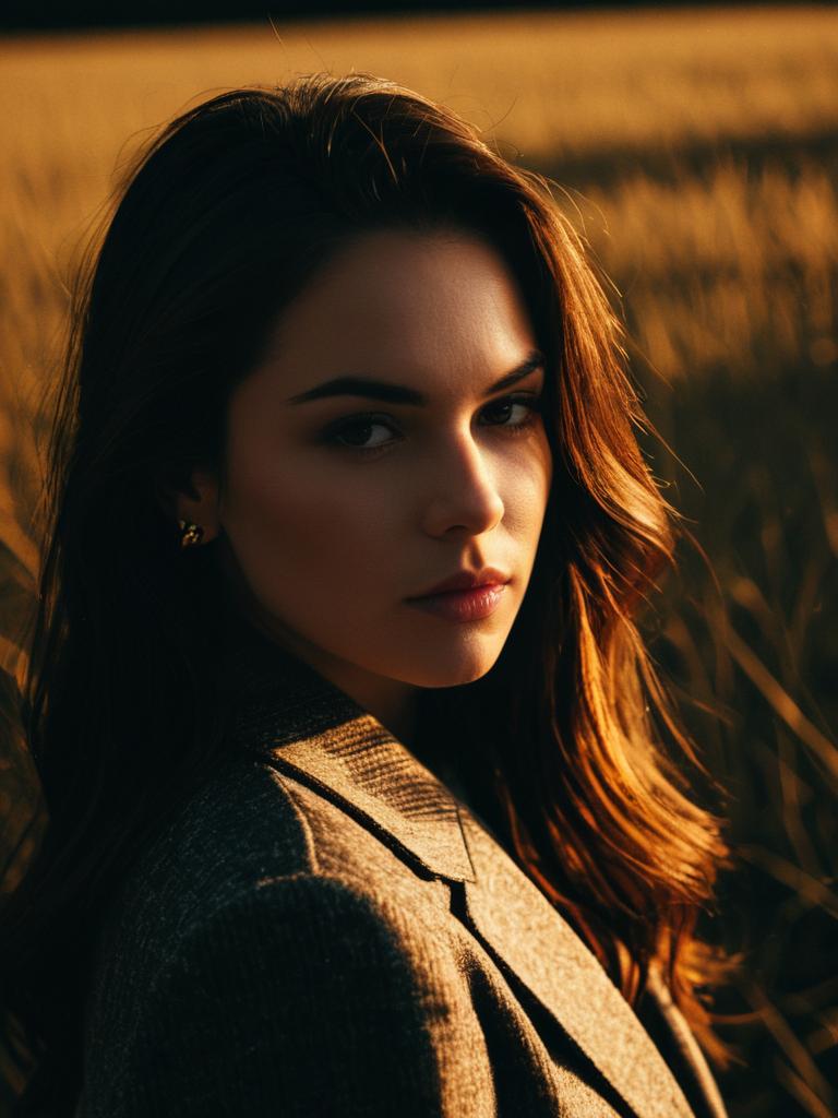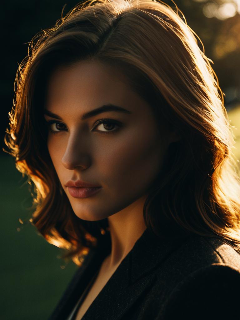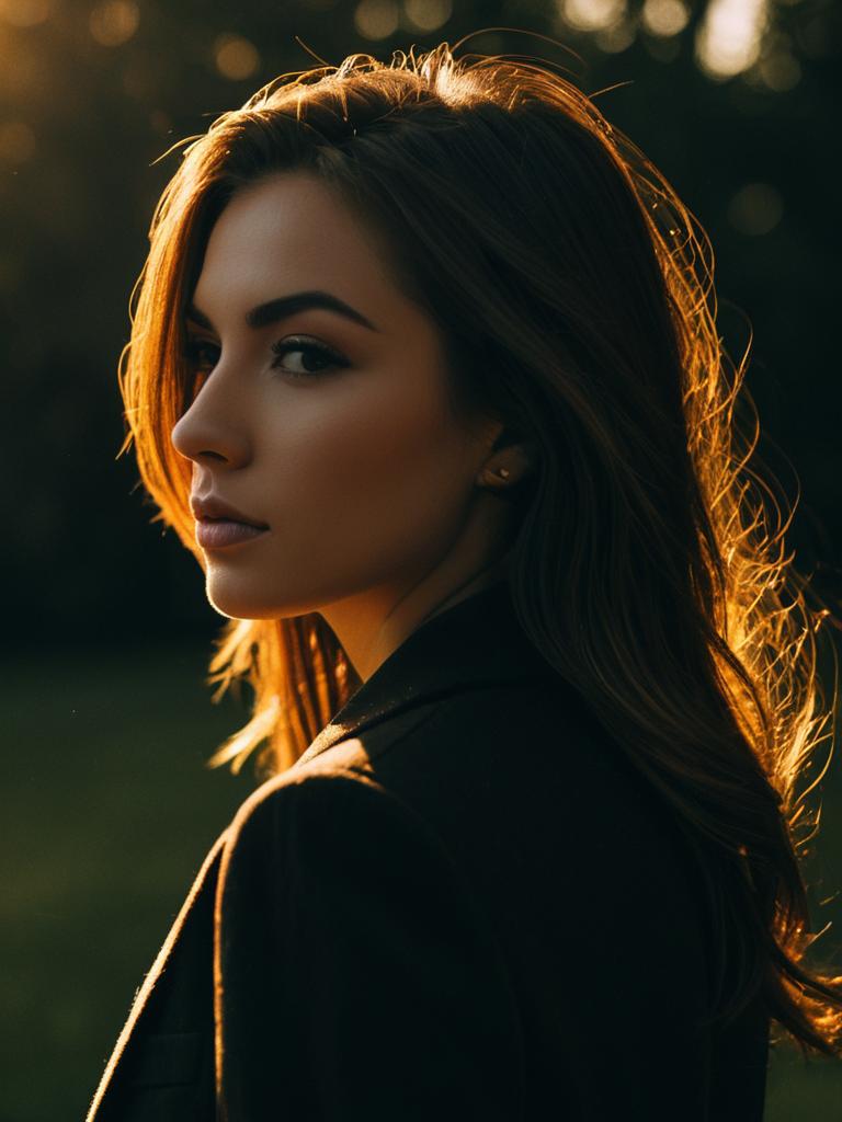 Close-up portrait of a young woman with medium-length hair, illuminated by strong side lighting creating dramatic shadows on her face and neck. The lighting emphasizes her facial features with a warm glow, and she wears a dark top in a moody setting.