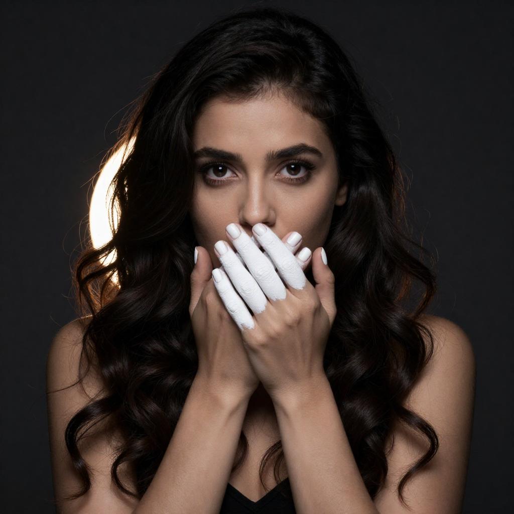 Photograph of a woman with long, dark, wavy hair. Her hands, painted white, cover her mouth and chin. She has intense, piercing green eyes. Background is dark, highlighting her face and hands. She is centered, looking directly at the camera.