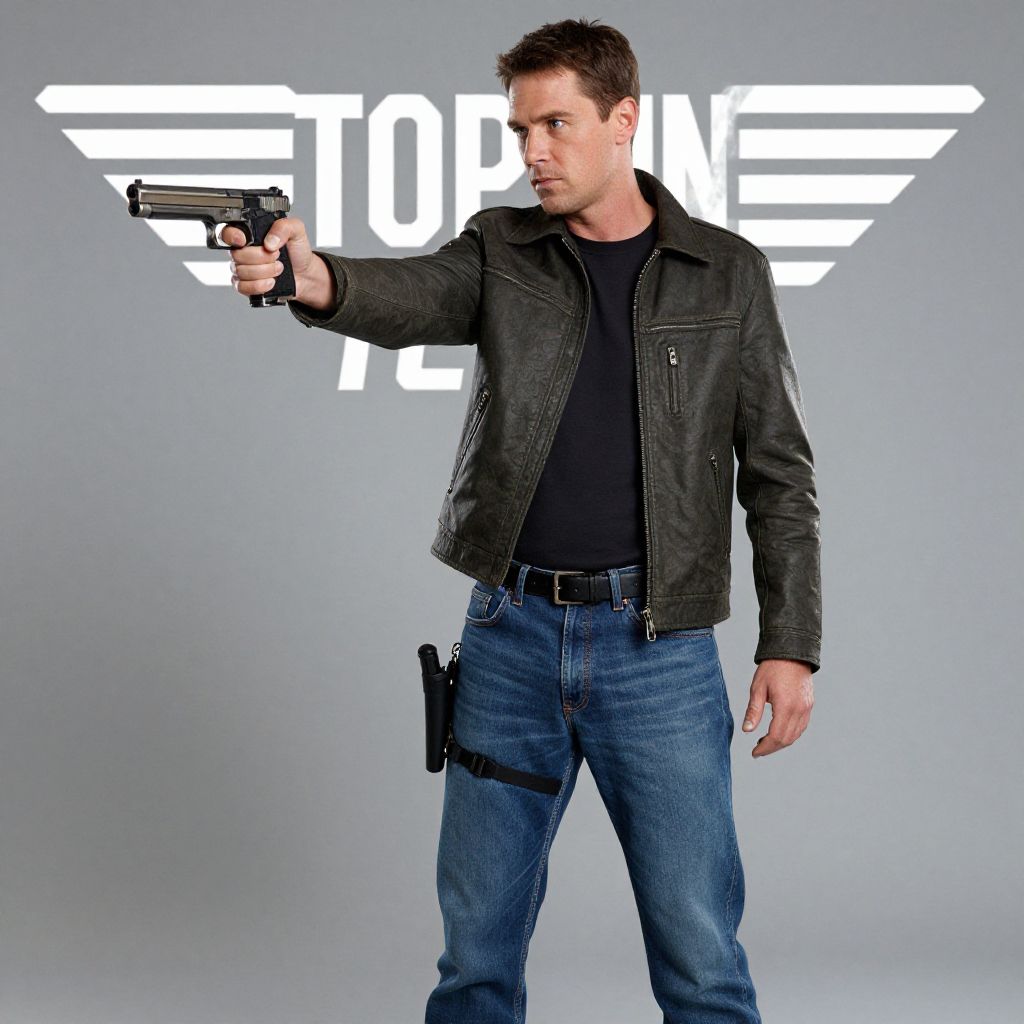 "Top Gun Character, image of a man in a jacket and jeans holding a gun"