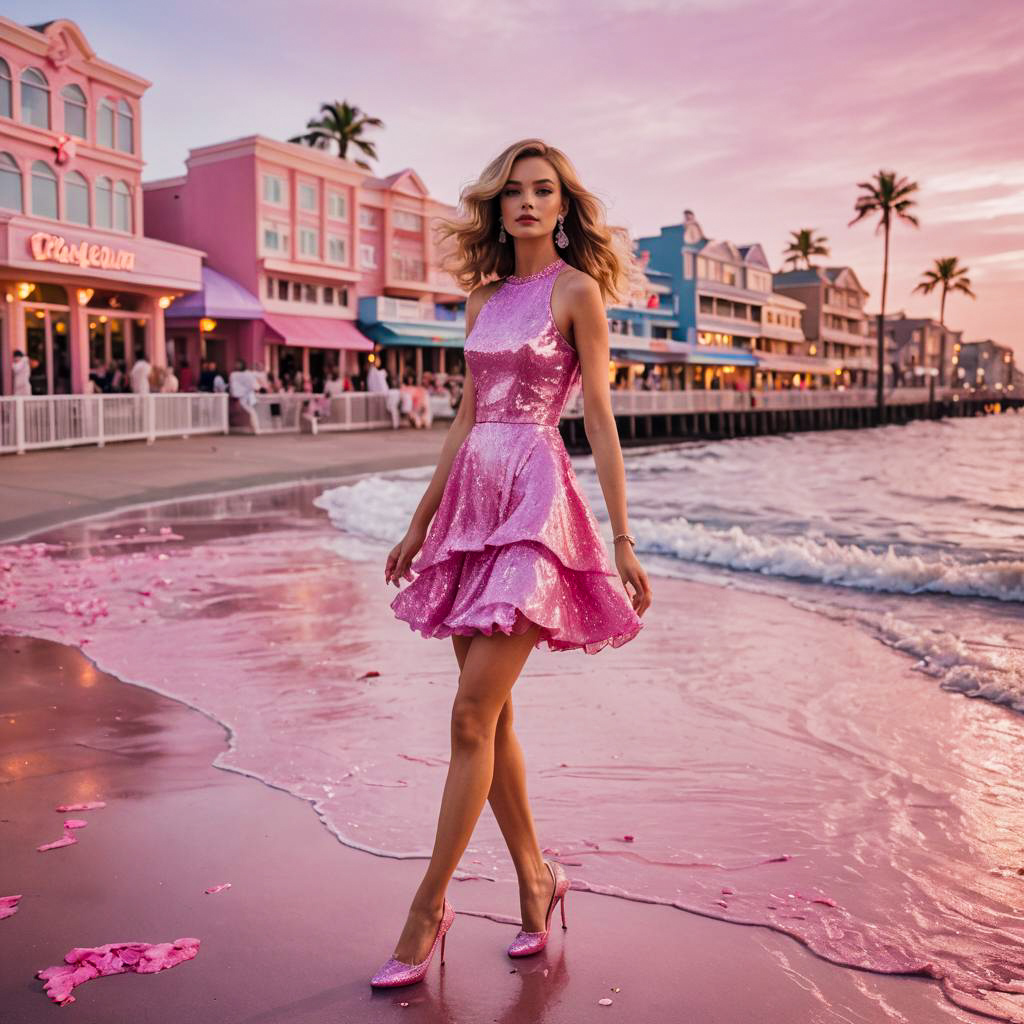 Slender woman with wavy bob hairstyle wearing a pink sparkly sequin mini dress and matching high heels standing on a beach near a seaside boardwalk at sunset. The background features colorful buildings, palm trees, and gentle ocean waves reflecting the pink hues of the sky.