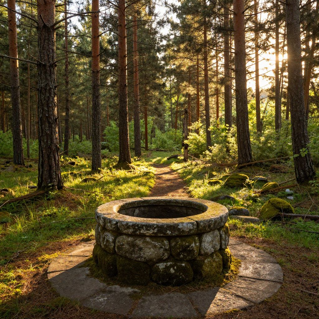 Photograph of a sunlit forest with tall, straight pine trees. In the foreground, a circular stone well with mossy texture and a dark, empty center is positioned on a stone platform. Sunlight filters through the trees, casting warm, golden light on the green ferns and grasses surrounding the well. The background shows a sunbeam breaking through the tree canopy, illuminating the forest floor. The path leading from the well into the dense woods is slightly visible, adding depth to the serene, natural setting.