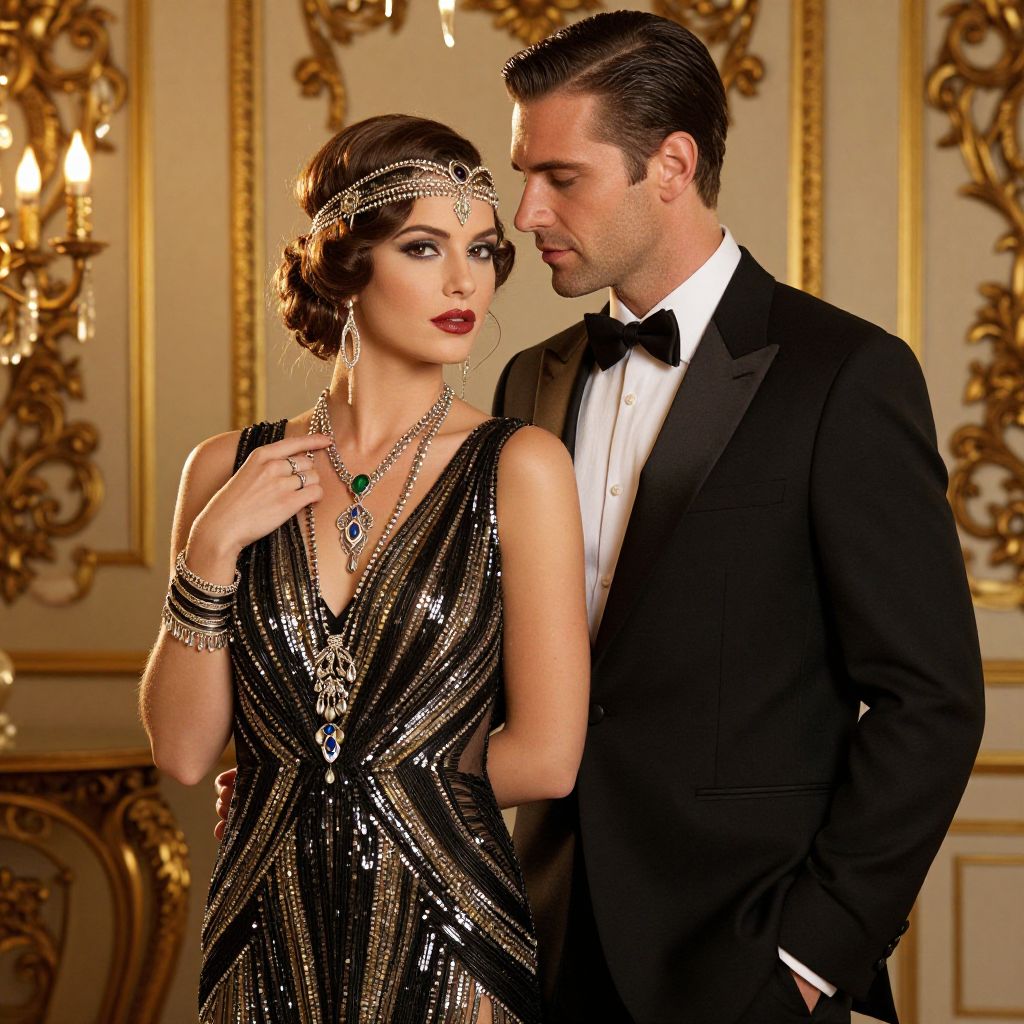 A glamorous pre-wedding photoshoot captures a couple in elegant attire, featuring a woman adorned in a black sequined dress with intricate jewelry and a man in a classic black tuxedo, set against a luxurious backdrop with warm, golden-hour lighting and ornate decor, evoking a timeless, high-definition Art Deco aesthetic reminiscent of the Great Gatsby era.