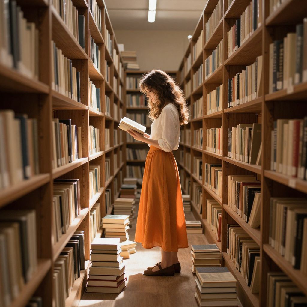 Photograph of a young woman with curly brown hair, wearing a white long-sleeve blouse and an orange high-waisted skirt, standing in a sunlit library aisle. She is holding a book, reading intently. The aisle is lined with tall wooden bookshelves filled with books, stretching into the background. Sunlight streams through the ceiling lights, casting warm, golden light on the woman and the books. Stacks of books are on the floor around her feet, creating a cozy, scholarly atmosphere. The image captures a peaceful, focused moment amidst a vast collection of literature.