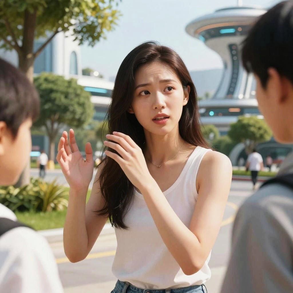 Portrait of an Asian woman with long dark hair and natural makeup, wearing a white sleeveless top and blue jeans. She is engaging in a dynamic conversation with two men in a vibrant futuristic park setting featuring advanced architecture and greenery under bright daylight. Her expressive gesture and concerned facial expression convey empathy and connection.
