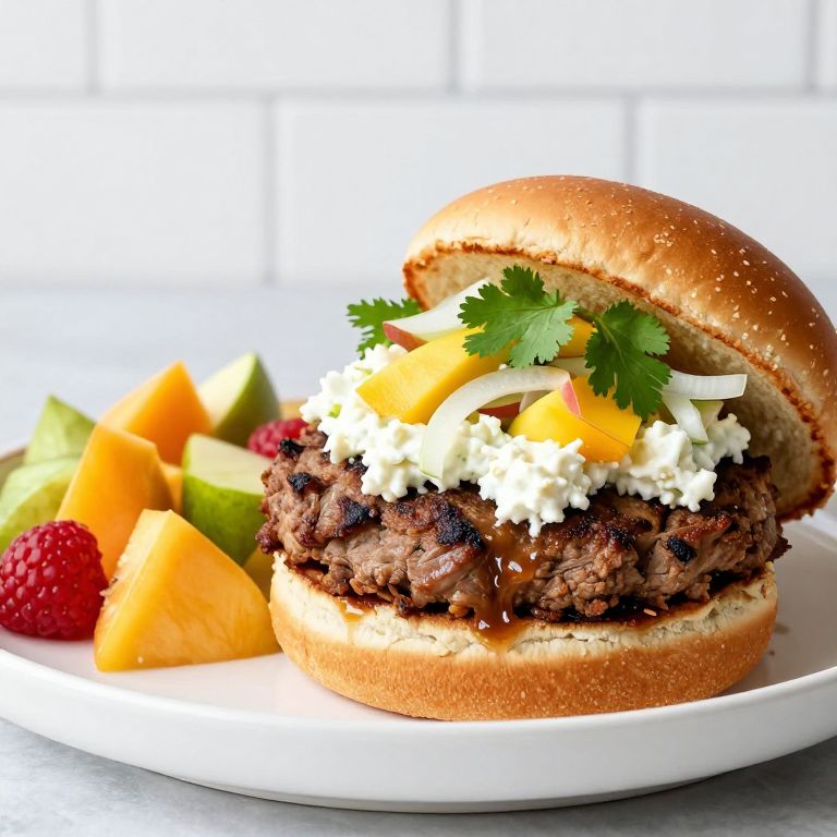 Jerk turkey burger topped with creamy feta, mango-apple slaw, fresh cilantro, and crisp onions, served on a golden bun with a side of vibrant fruit salad on a white plate against a clean tiled backdrop.