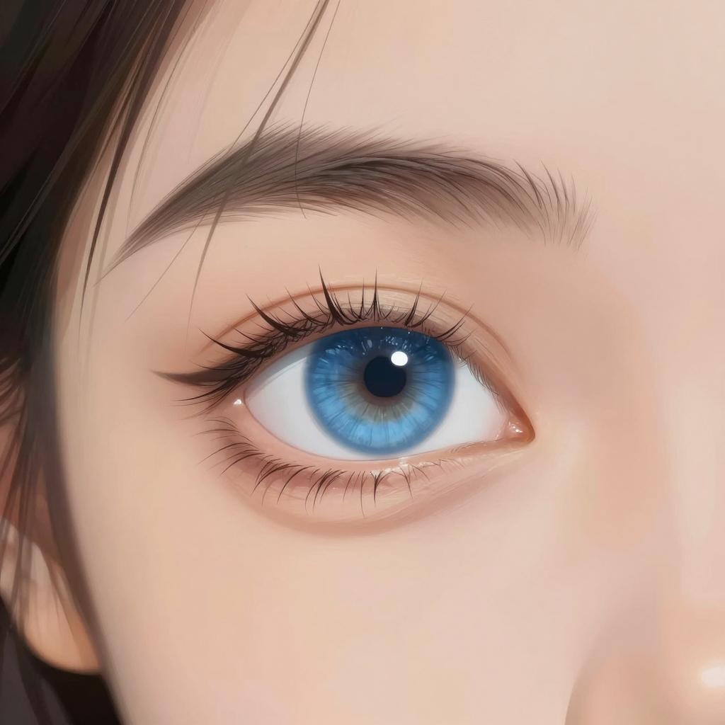 Detailed close-up digital illustration of a human eye with a bright blue iris and white reflections. The eye features prominent dark eyelashes and naturally tan skin with subtle shading. The background is black, emphasizing the eye's vivid colors and details.