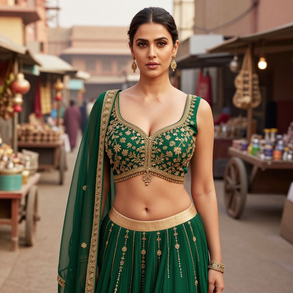 Photograph of a South Asian woman with medium brown skin and dark hair in a sleek bun, wearing a green and gold traditional lehenga choli with intricate embroidery. The top has a deep neckline and gold embellishments, while the skirt is adorned with gold thread. She accessorizes with gold earrings and a matching bracelet. The background shows a bustling street market with blurred stalls and people, creating a warm, colorful atmosphere. The lighting is natural, highlighting her confident pose and the detailed textures of her attire.