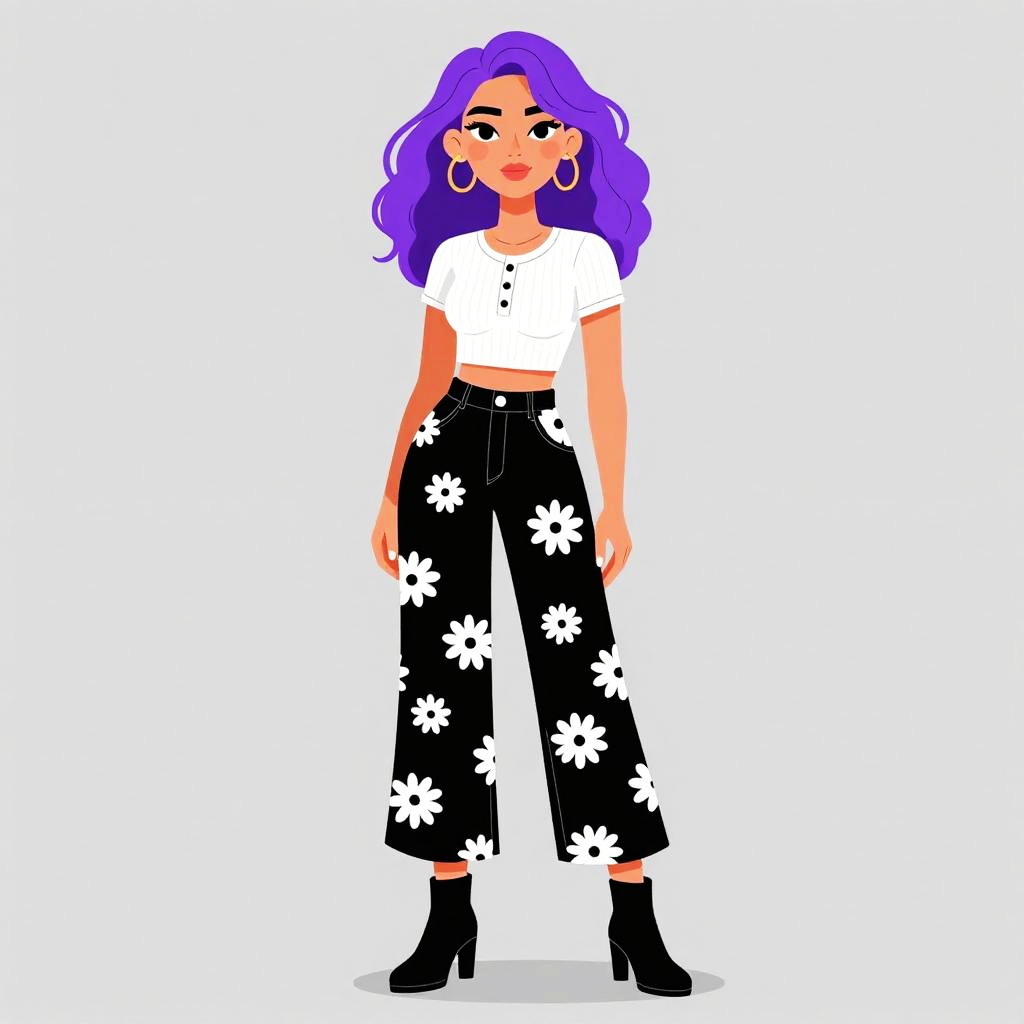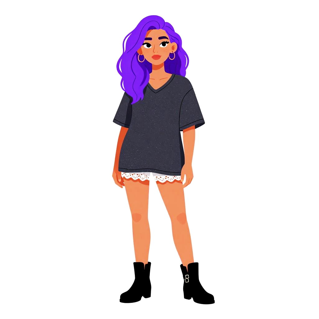 Woman with pretty face and pretty hair. Woman, casual boho, oversized dark grey heathered T-shirt, V-neck, short rolled sleeves, white lace-trimmed shorts peeking underneath, black ankle boots with buckle detail, white background in a photo studio setting. --sref 1467