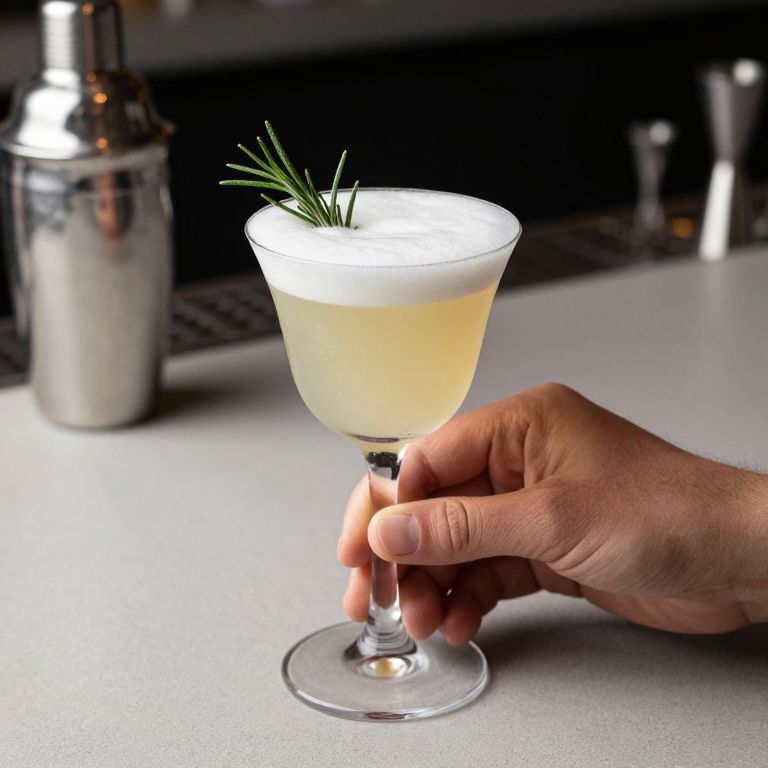 Hand presenting a frothy pale-yellow cocktail garnished with a sprig of rosemary in a stemmed glass, set against a minimalist countertop with a blurred background featuring a metallic shaker.