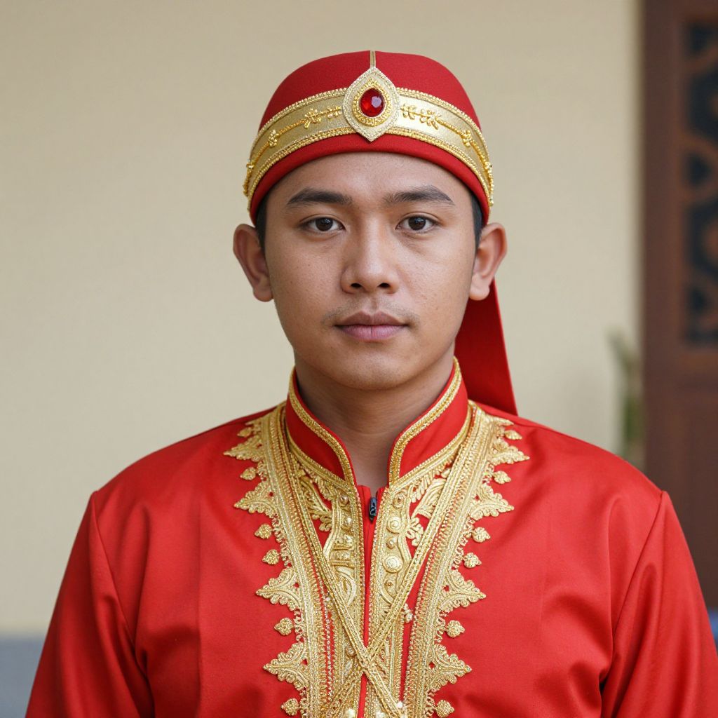 Maranao Prince Costume, a close up of a person in a red and gold costume