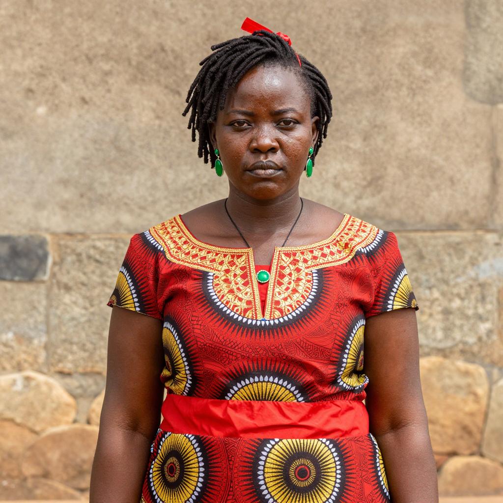 Portrait of a dark-skinned African man with a medium build and short graying beard, wearing an orange and red striped dashiki-style traditional shirt and a matching orange and green headwrap. The man is photographed outdoors with a blurred leafy green background under natural light, showing serious expression and frontal view. The fabric details of the traditional attire are clearly visible.