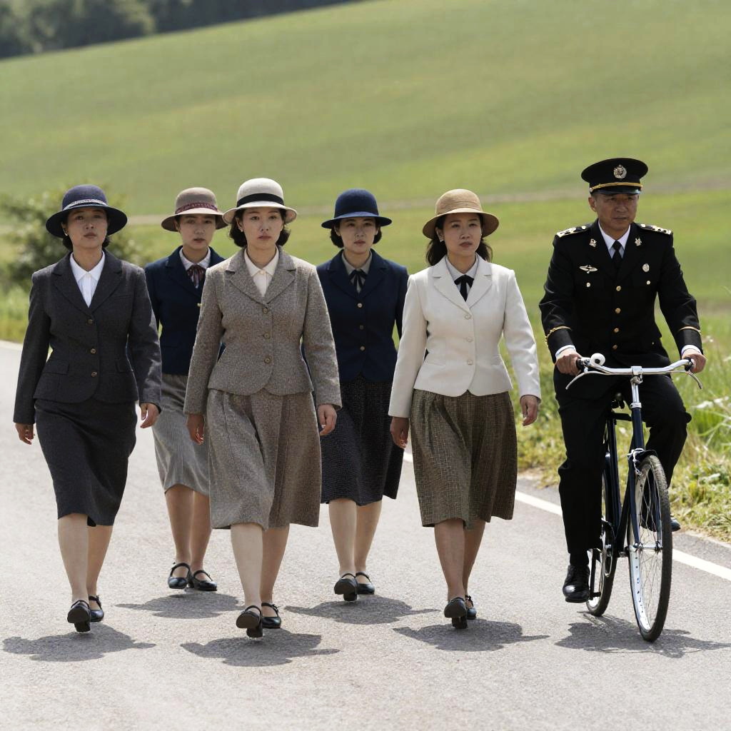 Black-and-white photograph of six people. Five women in ornate, frilled dresses and large feathered hats, standing in a line, legs crossed. One man in a suit, standing between them, hands in pockets. Background features trees and rocky hills. Women smile, man looks forward. Women wear gloves, high heels. Man in dress shoes. Altered poses, playful atmosphere. Mountainous background.