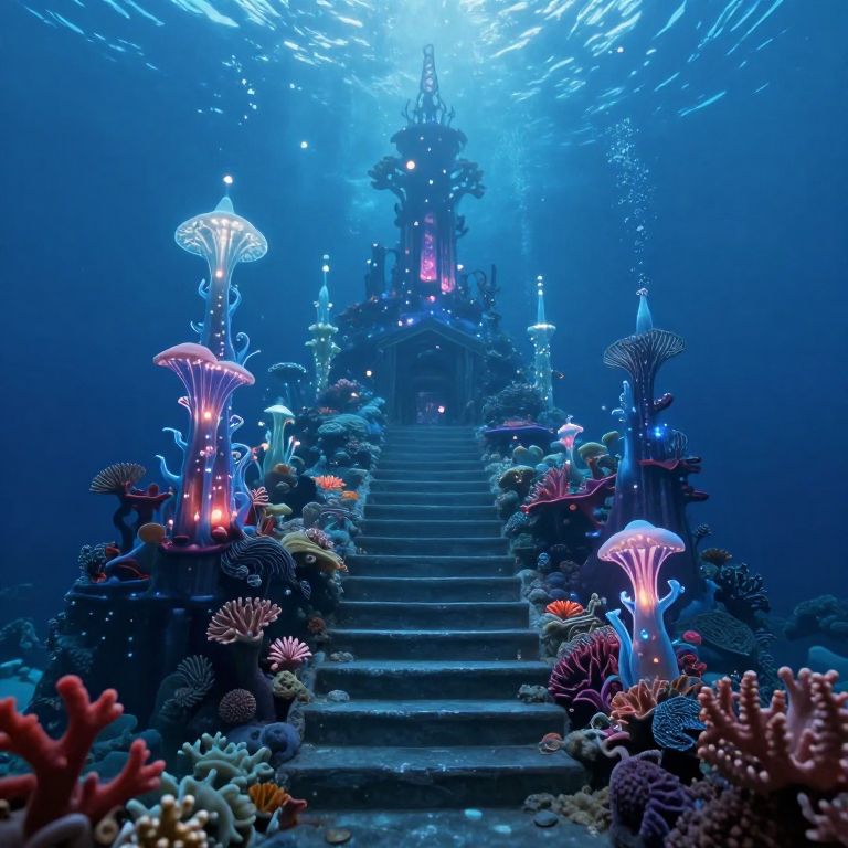 Photograph-style digital art of a spiral staircase descending into a glowing underwater cave, surrounded by coral and marine life.
