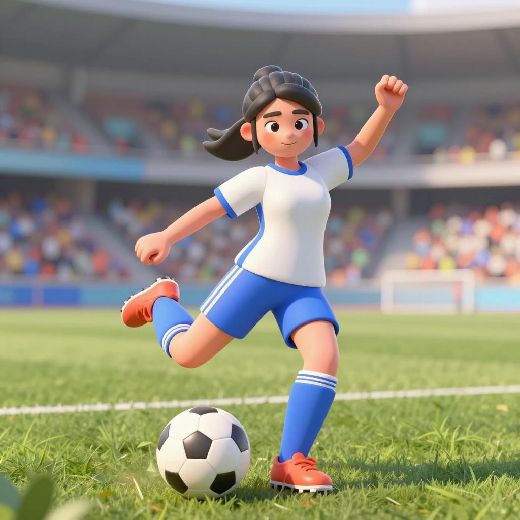 A confident young female soccer player kicking a soccer ball on a grass field in a large stadium with blurred crowd in the background, 3d cartoon style, clean rendering, vibrant colors, smooth shading, stylized character
