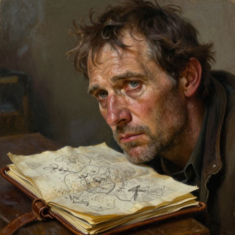This digital painting depicts a middle-aged man with disheveled brown hair and a beard, gazing intently at an open, aged sketchbook on a wooden table. His pale, slightly weathered face shows deep concentration. The sketchbook, with yellowed pages, contains intricate black ink drawings of abstract and human-like figures. The man wears a dark brown shirt, and the background is a blurred, dark brown, creating a focus on the subject and the sketchbook. The lighting emphasizes the man's face and the sketchbook, casting soft shadows. The overall style is realistic with a painterly texture, capturing a moment of intense creativity.