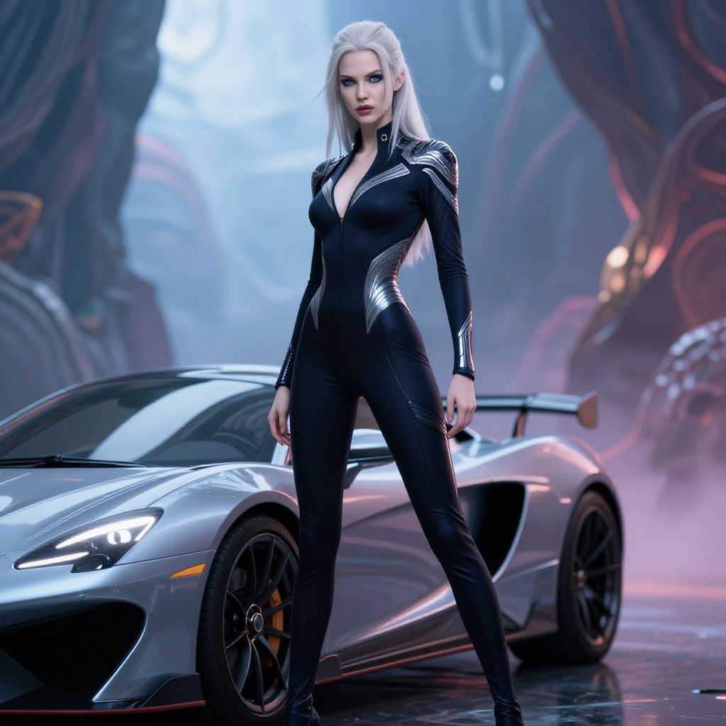 Photorealistic digital art depicts a striking woman with long, platinum blonde hair standing confidently in front of a sleek, silver sports car. She wears a form-fitting, black leather bodysuit with a deep V-neck, accentuating her slender yet curvy figure and small breasts. Her skin is fair, and she has sharp, defined features with red lipstick. The background features a futuristic, cyberpunk-style setting with neon lights and intricate, organic-like structures. The car has black wheels and a glossy finish, adding to the high-tech atmosphere. The overall image exudes a sense of power and sophistication.