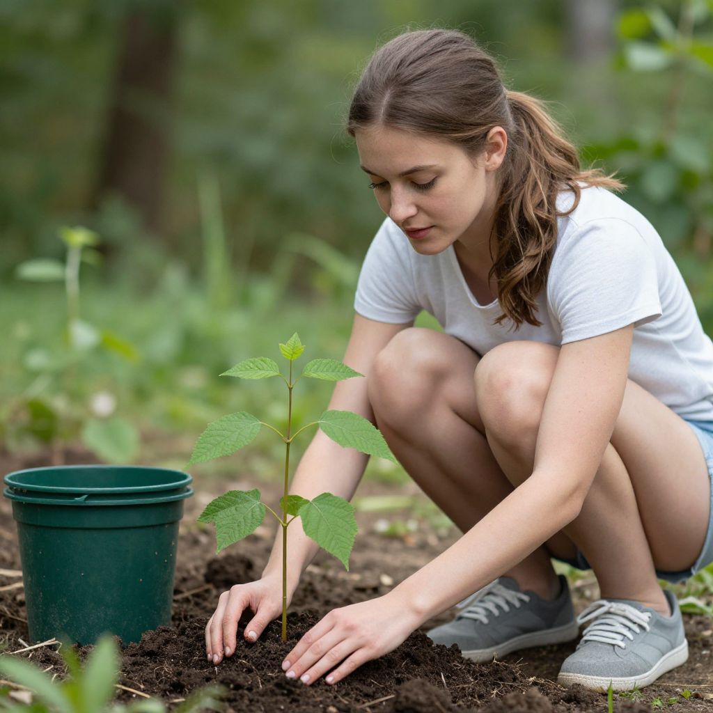 Young woman crouching outdoors, gently placing soil around a small sapling with vibrant green leaves, embodying eco-friendly gardening in a lush, natural setting.