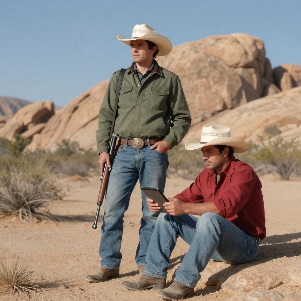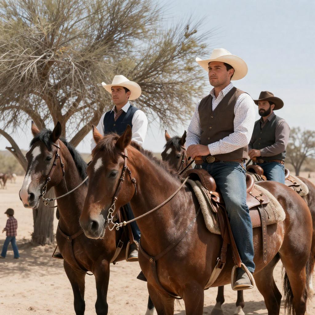 Photograph of three men in cowboy attire riding horses in a desert setting. Two men in the foreground wear vests and hats, one has a beard. Third man in background wears similar outfit. Leafless tree in background. Child in plaid shirt on left. Saddlebags on horses. Clear sky. Horses facing left. Riders' expressions neutral. One horse in front, two partially visible behind.