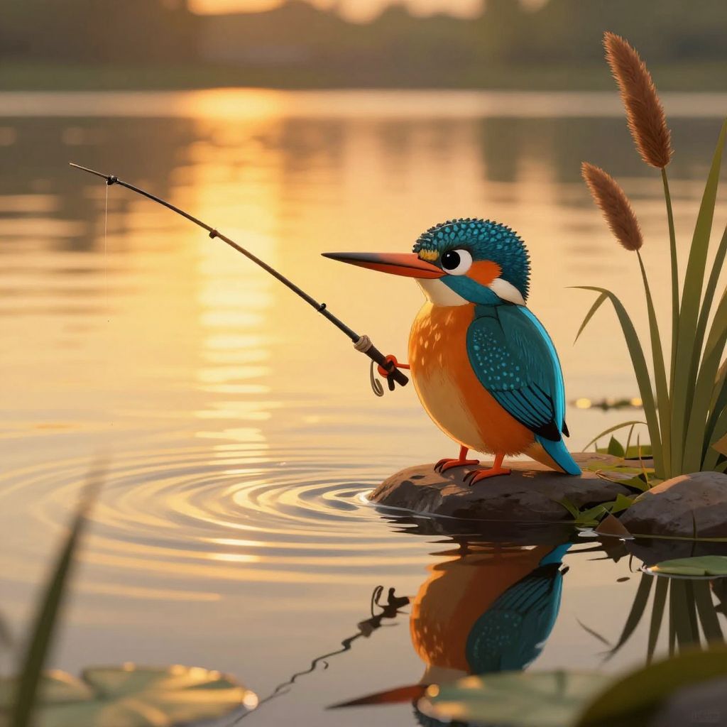 Kingfisher cartoon fishing at golden sunset by the lake, reflective water surface, dramatic lighting casting long shadows, charming smile and animated expressive eyes, stylized nature elements like reeds and lily pads, warm color palette