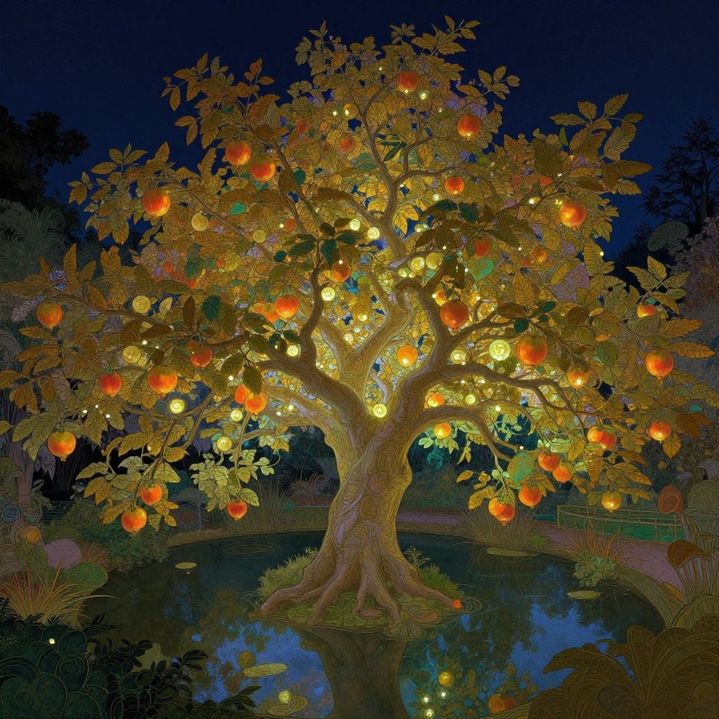 Create an enchanting image by blending the ethereal elegance of Art Nouveau with Surrealist whimsy. Picture a magnificent tree, its branches laden with luminescent fruit and glowing leaves that cast an array of vivid hues across the night sky. From a high vantage point, witness this fantastical scene unfold within a tranquil pond, as if gazing upon a dreamlike world where nature and magic entwine. This mesmerizing fusion of ornate beauty and Surrealist vision stirs deep wonder and awe in the viewer.