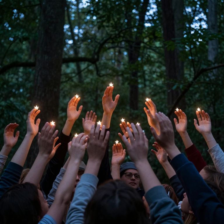Photograph of a group of people in a forest at dusk, raising their hands to light small candles. The hands, of varying sizes and skin tones, are illuminated by the candlelight, creating a warm, glowing effect against the dark, dense trees in the background. The people wear casual clothing, including jackets and a beanie. The candles are small and bright, casting a soft, flickering light. The overall scene conveys a sense of unity and reverence, with the natural forest setting enhancing the spiritual atmosphere.