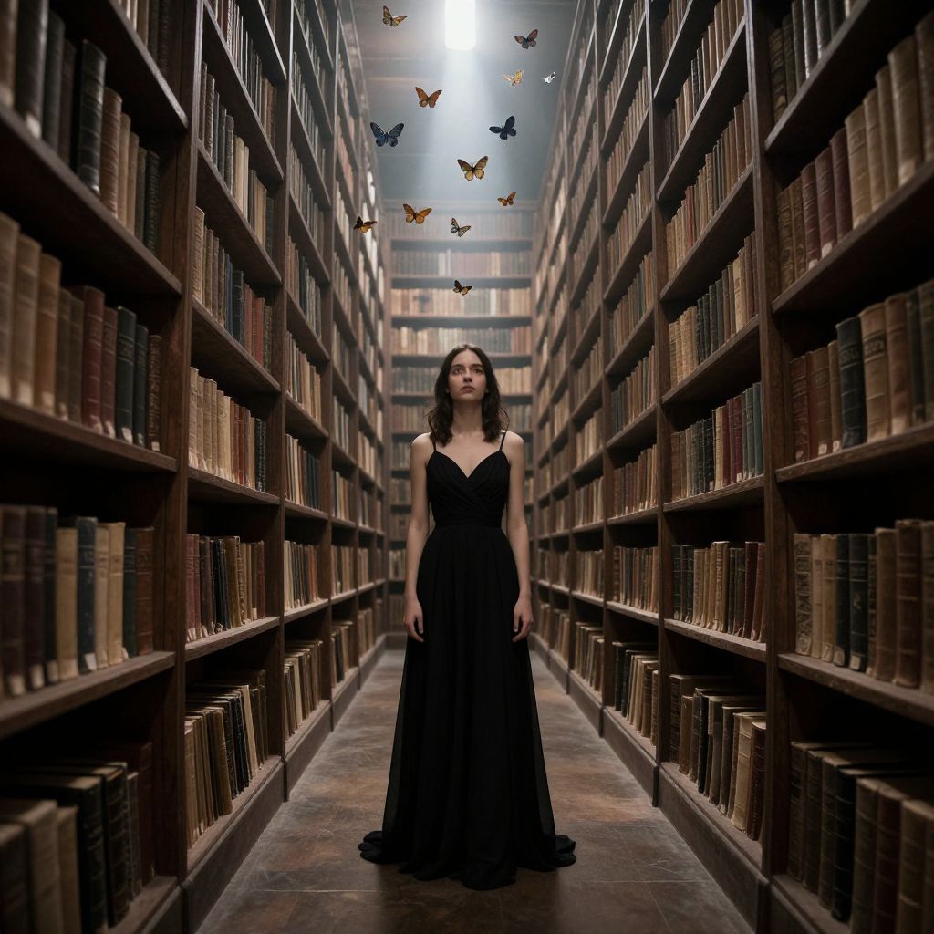 Mysterious woman in a flowing black gown stands solemnly in a dimly lit library aisle, surrounded by towering shelves of ancient books, as butterflies flutter upwards toward a radiant light source at the end of the corridor.