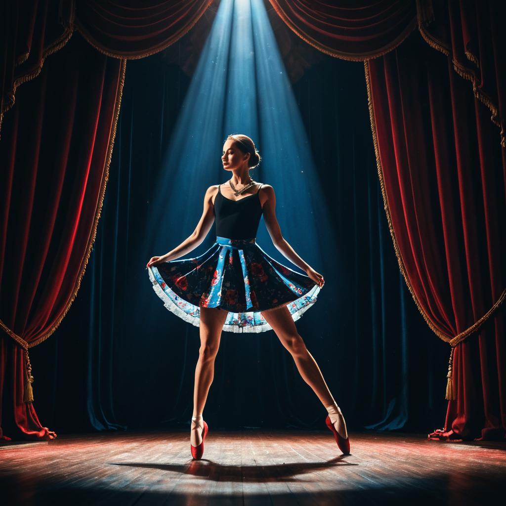 Ballerina Bun hairstyle on fashion model, wearing sleek leotard and mesh wrap skirt, in photo studio, captured in fashion editorial style with bright spotlight.