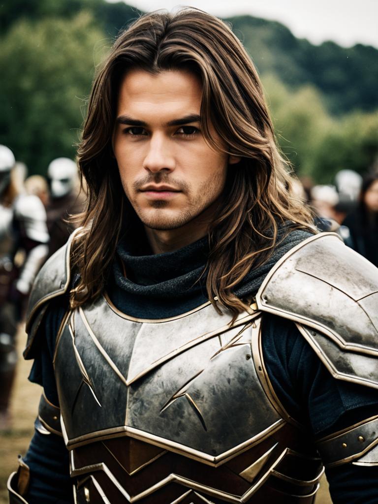 Earth warrior costume, solo, blurry background, blurry, armor, outdoors, upper body, looking at viewer, 1boy, brown hair, long hair, male focus, brown eyes, closed mouth, 1girl