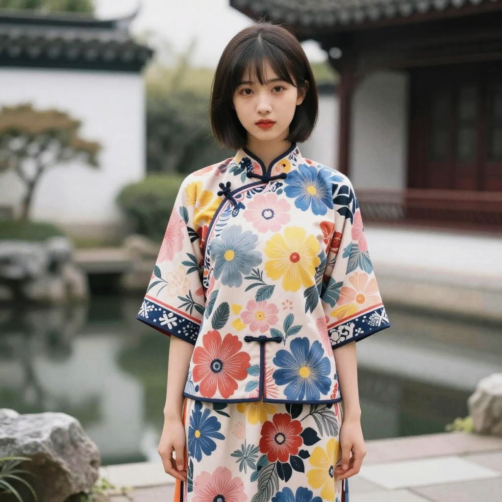(hanfu), (chinese clothes), ((floral print)), ((pink/yellow/blue/white/red/black print chinese shirt)), ((pink/yellow/blue/white/red/black print long skirt)), 1 girl, full body, (short hair), (realistic:1.7), ((best quality)), absurdres, (ultra high res), (photorealistic:1.6), photorealistic, octane render, (hyperrealistic:1.2), (photorealistic face:1.2), (8k), (4k), (Masterpiece), (realistic skin texture), (illustration, cinematic lighting, wallpaper), ( beautiful eyes:1.2), ((((perfect face)))), (cute), (standing), (black hair), black eyes, red lips, outdoors, (chinese style countryard)