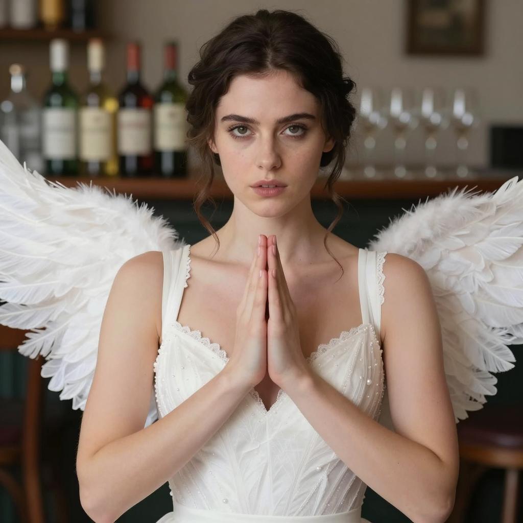 Woman with fair skin, dark brown hair in an updo, wearing a white dress with feathered wings, hands pressed together in a prayer position. Background: blurred bar setting with bottles and glasses. Intense gaze. Natural light. Upper body focus.