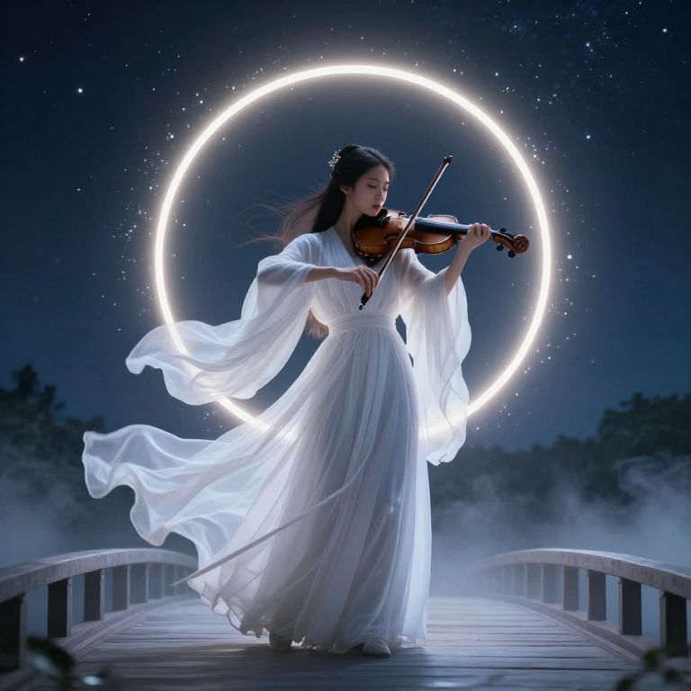 A spectral figure in flowing white robes stands ethereally on a misty bridge, playing a violin beneath a radiant cosmic ring that defies the night sky, weaving a spellbinding melody that seems to bend the fabric of reality.