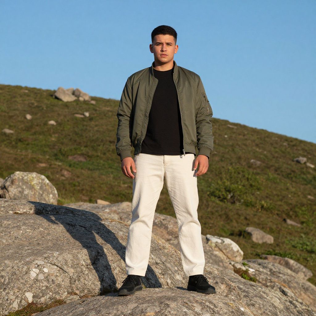 Photograph of a young man standing confidently on a rocky outcrop. He has short, dark hair and a medium build. He's wearing a black t-shirt, olive green bomber jacket, and cream-colored pants with black shoes. The background shows a clear blue sky and a lush, green hill with scattered rocks. The sunlight casts sharp shadows, highlighting the textures of the rocks and his outfit.