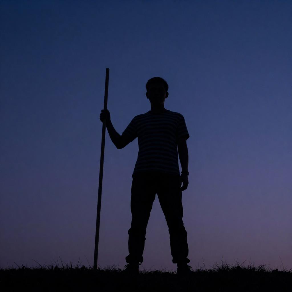 Silhouette of a man standing outdoors at dusk, facing forward. He holds a long pole in his right hand. Dark blue and purple sky in the background. Man's clothing has horizontal stripes. Grass at the bottom.