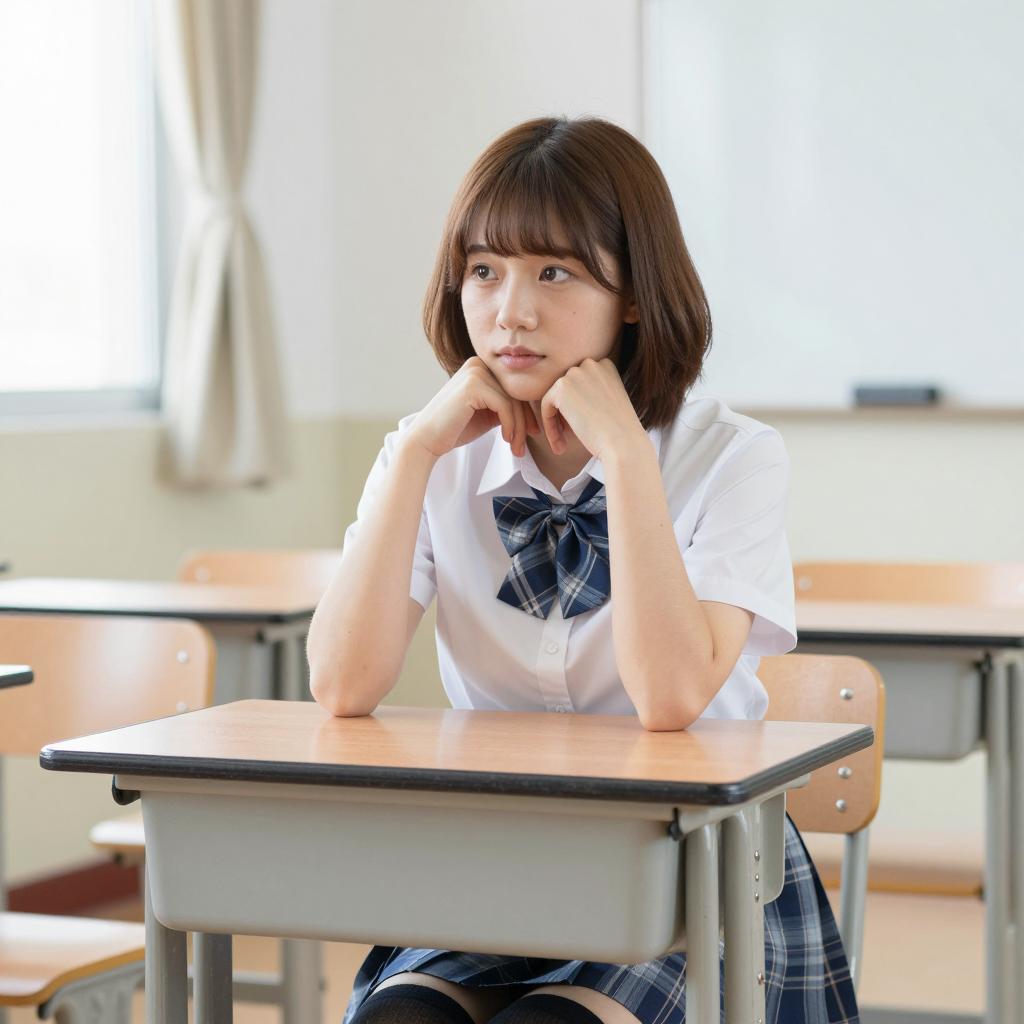 A woman in a classroom. She stands in front of a large chalkboard, wearing a white blouse and long skirt. Her right hand holds a chalk piece, and her left hand rests on her hip. She has short, dark hair and looks to the side with a neutral expression. The chalkboard has cursive and a small sketch of a person in the upper right corner. Wooden cabinets are at the bottom of the image.