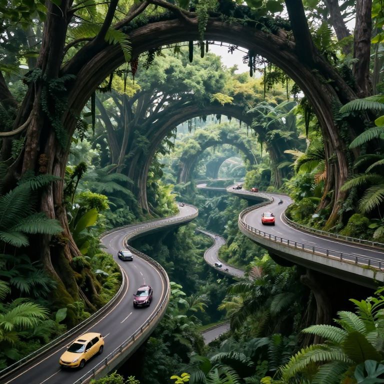 Vehicles traverse ethereal, gravity-defying roadways suspended between colossal, living tree arches, creating a surreal forest tunnel where nature and technology merge in impossible harmony.
