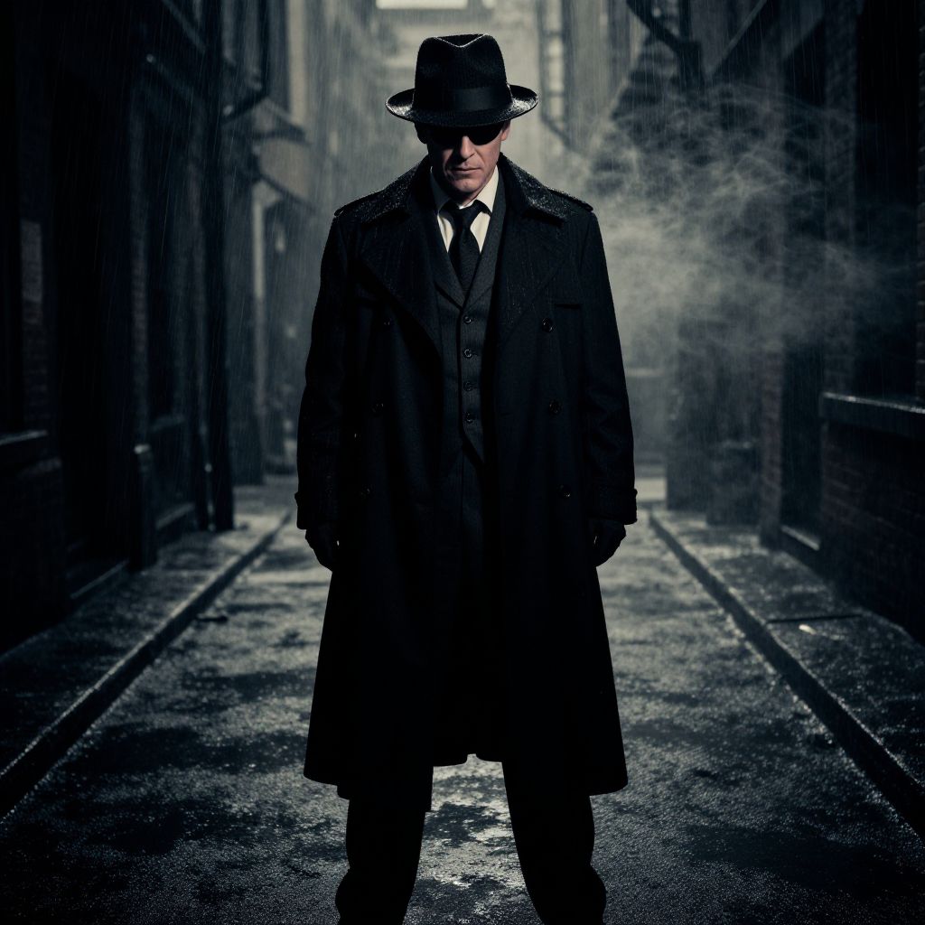 Noir detective costume worn by a mysterious figure standing in a rain-soaked alley, dramatic shadows and fog, vintage fedora and trench coat, moody monochrome palette with hints of deep blue and sepia, cinematic 1940s crime noir style lighting