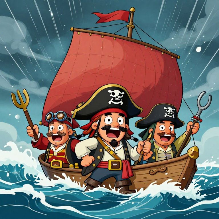 Cartoon drawing prompts focusing on an adventurous pirate crew sailing through stormy seas, exaggerated facial expressions, vivid colors, energetic and fun atmosphere