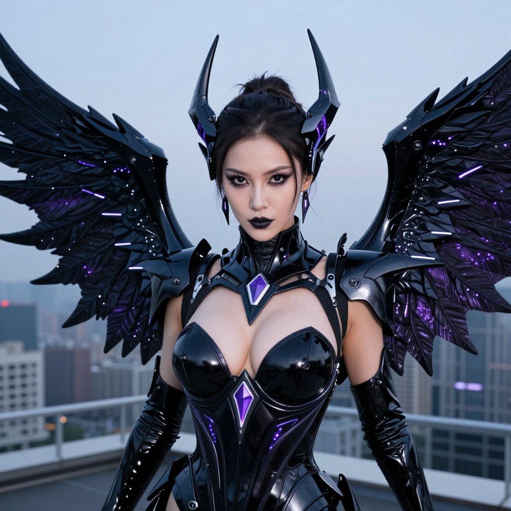 A powerful woman in a futuristic dark angel costume with imposing black wings made of obsidian metal and bioluminescent veins, posing in a high-rise rooftop cityscape at dusk, her sharp angular face, angular jawline, and piercing black eyes convey authority and mystery, styled with edgy glam makeup and cyberpunk aesthetics, glowing wings pulsing with a soft violet hue.. The woman has big tits and cute face
