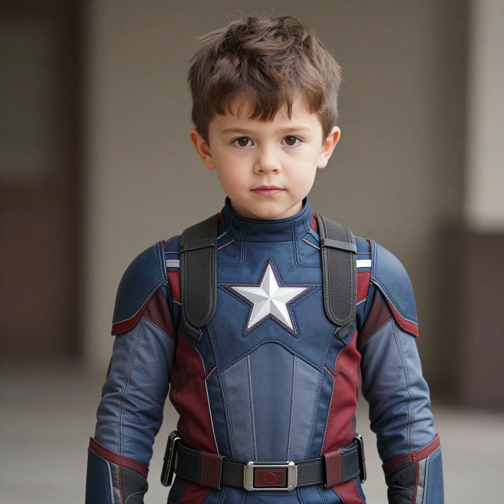 Photograph of a young boy with light skin and dark brown hair, wearing a detailed blue and maroon superhero costume with a prominent white star on the chest. The costume features black straps and a belt with a buckle. He stands in front of a blurred, gray-toned background, looking directly at the camera with a serious expression. The costume has a sleek, textured fabric with red and blue panels, and the overall style is reminiscent of Marvel's Captain America outfit. The lighting is even, highlighting his determined gaze and the intricate design of the costume.