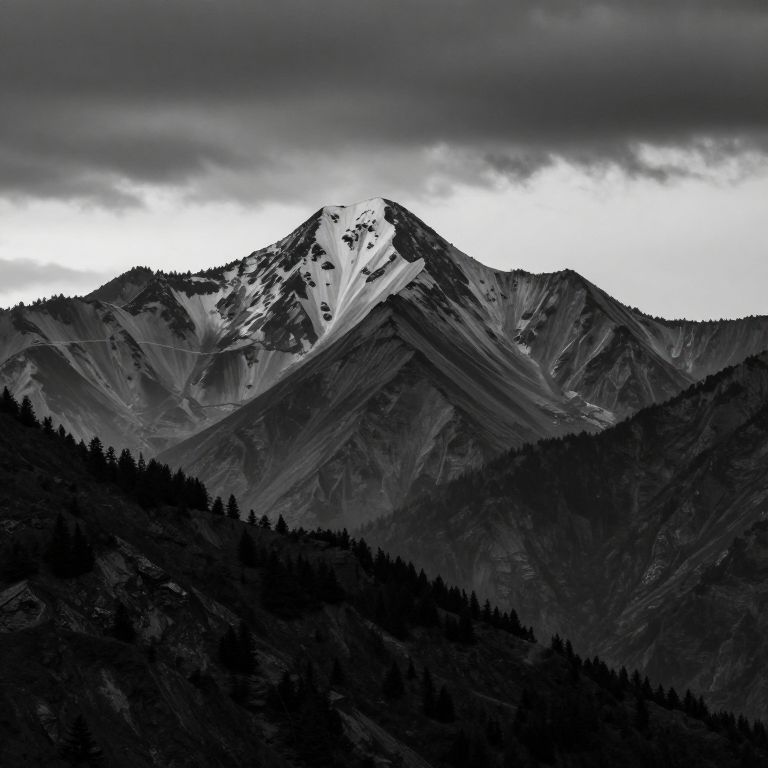 This photograph captures a dramatic, monochromatic mountain landscape. A snow-capped peak, partially veiled by dark, ominous clouds, rises in the center. The mountain's rugged, textured slopes are contrasted by darker, shadowed areas, while a forest of dense, dark evergreen trees occupies the foreground. The sky above is a gradient from white near the horizon to dark gray at the top, enhancing the stark contrast. The overall mood is moody and somber, with the high contrast and dark tones emphasizing the mountain's majesty and the foreboding weather.