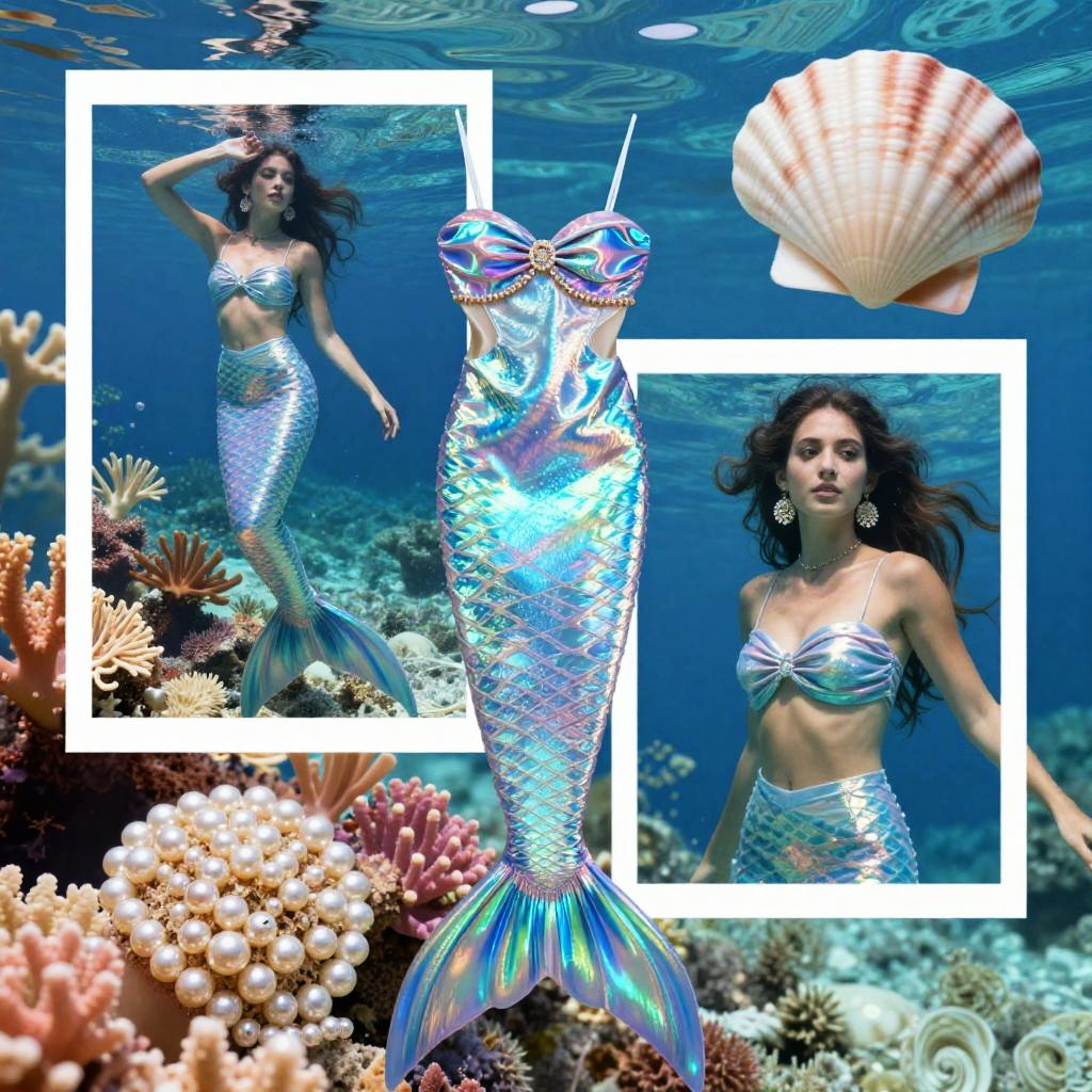 Stylish moodboard collage with a mermaid underwater fantasy, featuring flowing iridescent dresses and shell accessories. The background includes coral reefs and pearl clusters to add a natural touch. The color palette is bold and colorful, with a high-fashion editorial style. Layered images create a cohesive and visually captivating moodboard, blending vibrant colors with carefully curated fashion elements for an inspiring, trend-focused design.