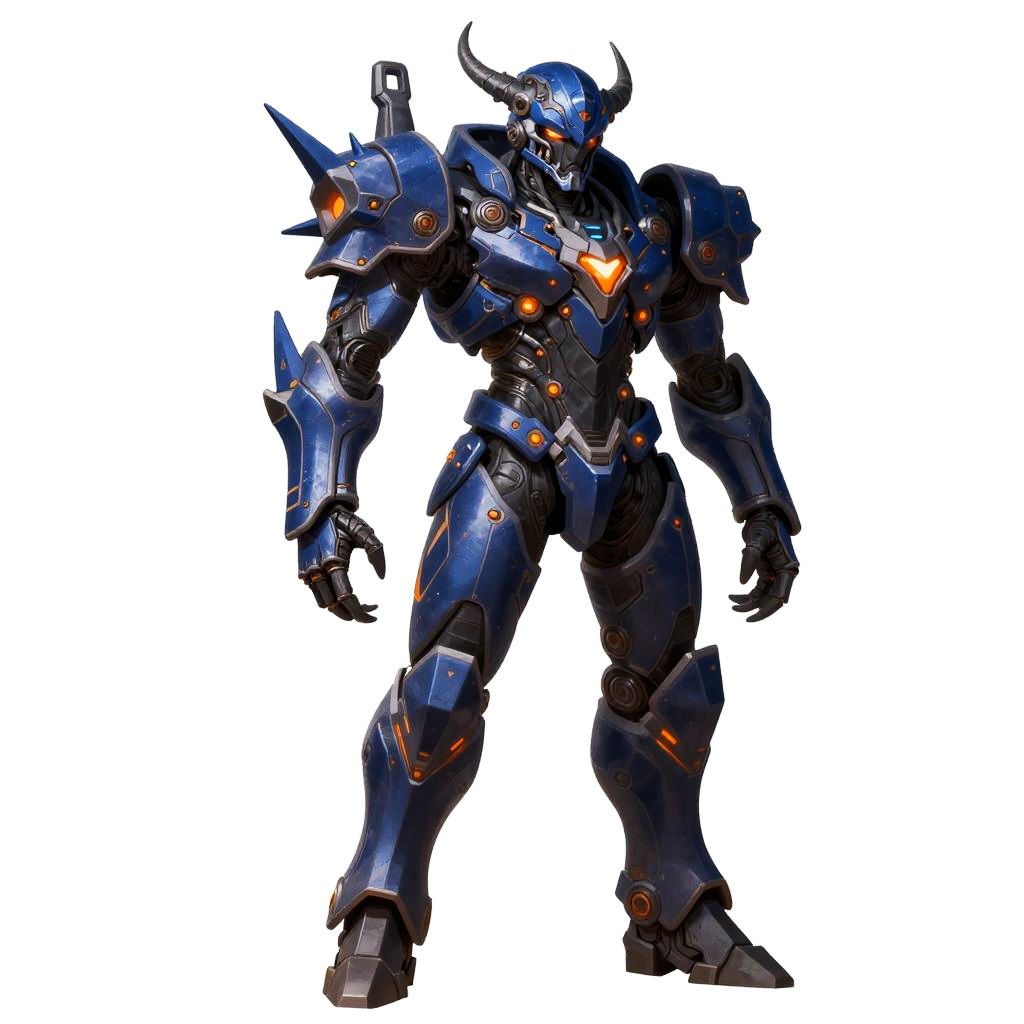 This is a digital drawing of a futuristic, alien warrior. The character has a dark blue and black armored body with glowing orange accents and intricate, spiky shoulder plates. Its face is hidden behind a helmet with a menacing, horn-like structure. The warrior's arms and legs are heavily armored, and it has large, claw-like hands and feet. The background is plain white, making the character stand out. The style is highly detailed and somewhat pixelated, giving it a sci-fi, cyberpunk vibe.