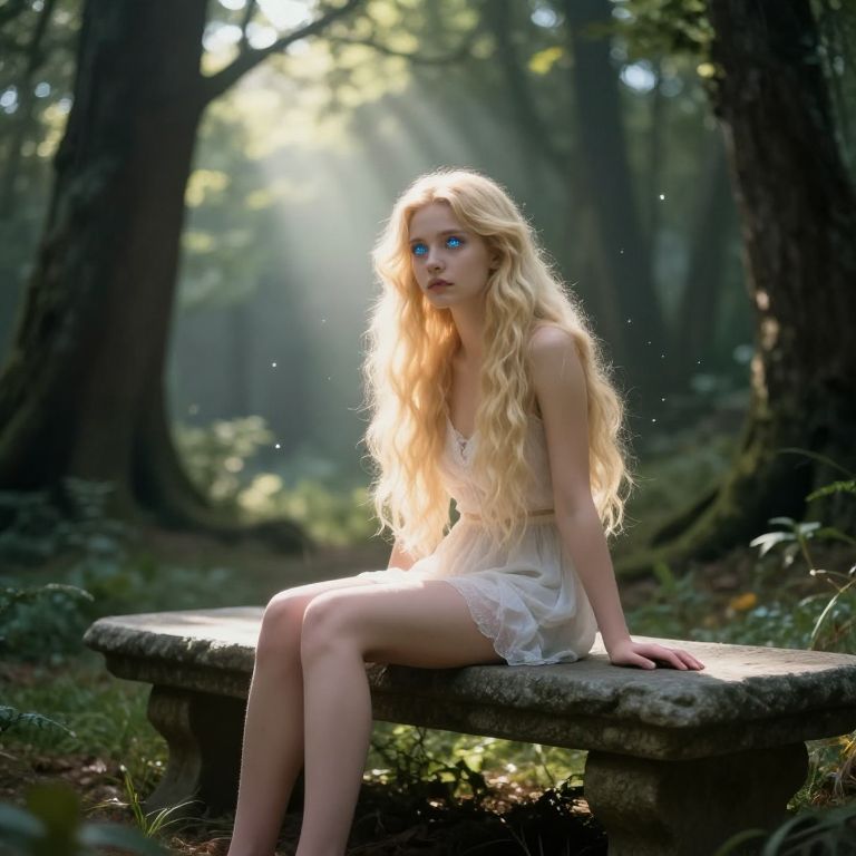 Photograph-like digital art of a blonde woman with long, wavy hair, fair skin, and striking blue eyes, sitting on a moss-covered stone bench in a sunlit forest. She wears a sheer, white, lace-trimmed dress that reveals her slender, pale legs. Sunbeams pierce the dense, green foliage, creating a magical, ethereal atmosphere. Her expression is serene, and her delicate, almost otherworldly beauty is highlighted by the soft, glowing light. The background features tall trees with rough bark, and sunlight filters through the leaves, creating a dappled effect on the forest floor.