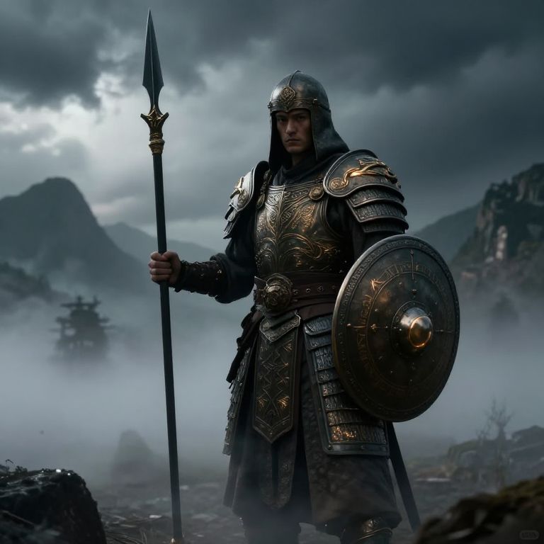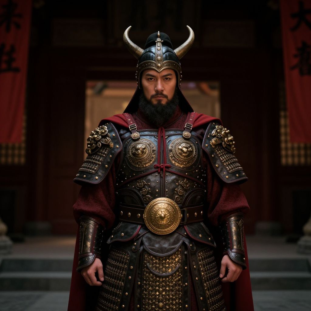 A tall, strong male warrior stands confidently in a grand battlefield setting, wearing elaborate red and gold armor that gleams under the sunlight. The armor features intricate detailing with golden runes and patterns, and his red cape flows dramatically behind him, catching the wind. He wears a regal gold helmet with a crest-like design, giving him a noble and imposing presence. His eyes are sharp and determined, reflecting both courage and wisdom. The background shows a lush, ancient landscape with distant mountains and a golden sunset, enhancing the epic and heroic atmosphere.