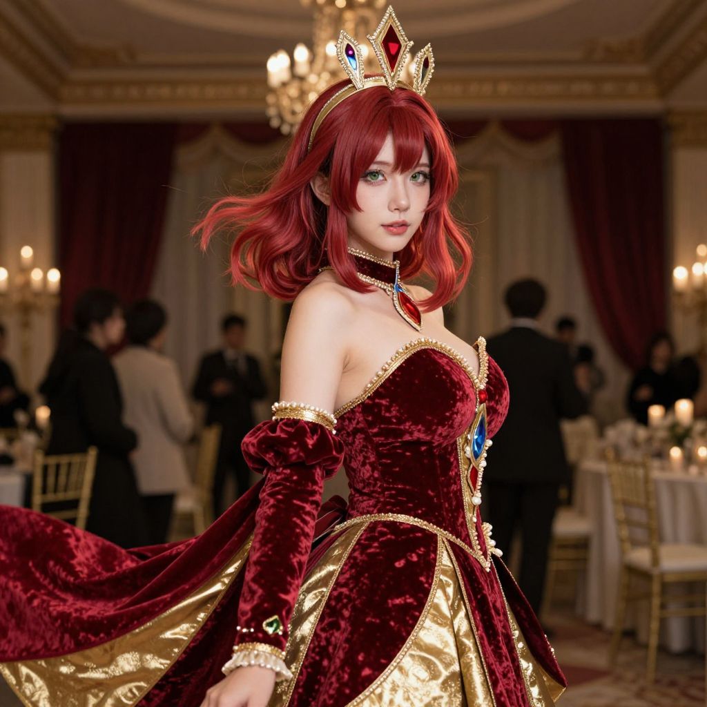 A dynamic shot of a woman in a glamorous red ombre shoulder-length hairstyle, wearing a costume made of red and gold velvet with a crown-like structure and flowing skirts, set in a high-end cosplay event at a themed ballroom with dim lighting and candlelight. She has fair skin, piercing green eyes, and a poised, elegant demeanor.. The woman has big tits and cute face