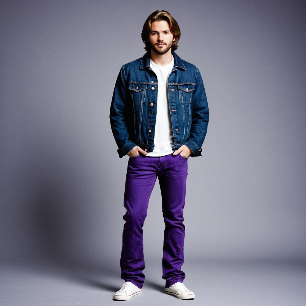 Purple jeans man costume ,1boy, male focus, solo, pants, jacket, hands in pockets, denim, shirt, facial hair, white shirt, realistic, jeans, standing, shoes, brown hair, full body, looking at viewer, denim jacket, open jacket, purple pants, sleeves rolled up, open clothes