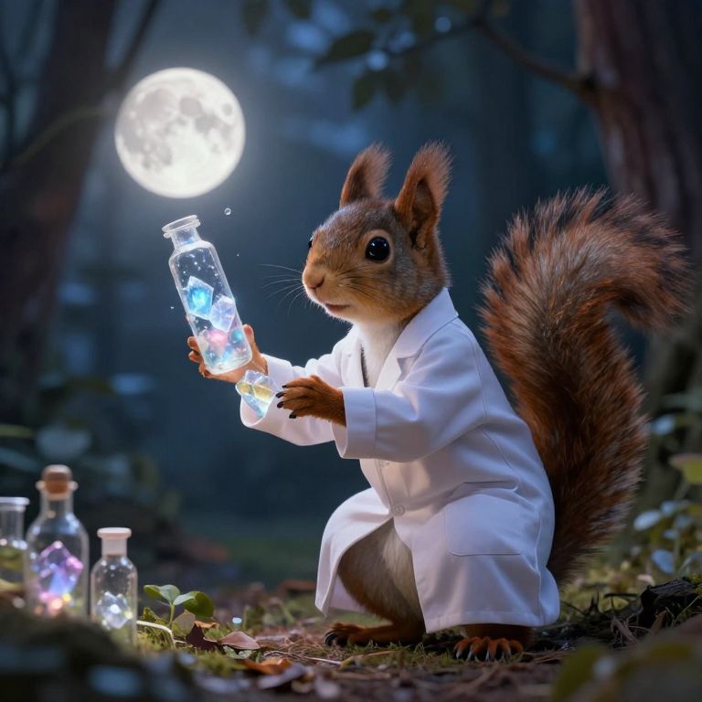 A whimsical squirrel scientist, clad in a lab coat, conjures ethereal moonlight into luminous, crystalline vials that glow softly against the enchanting backdrop of a forest under nightfall.