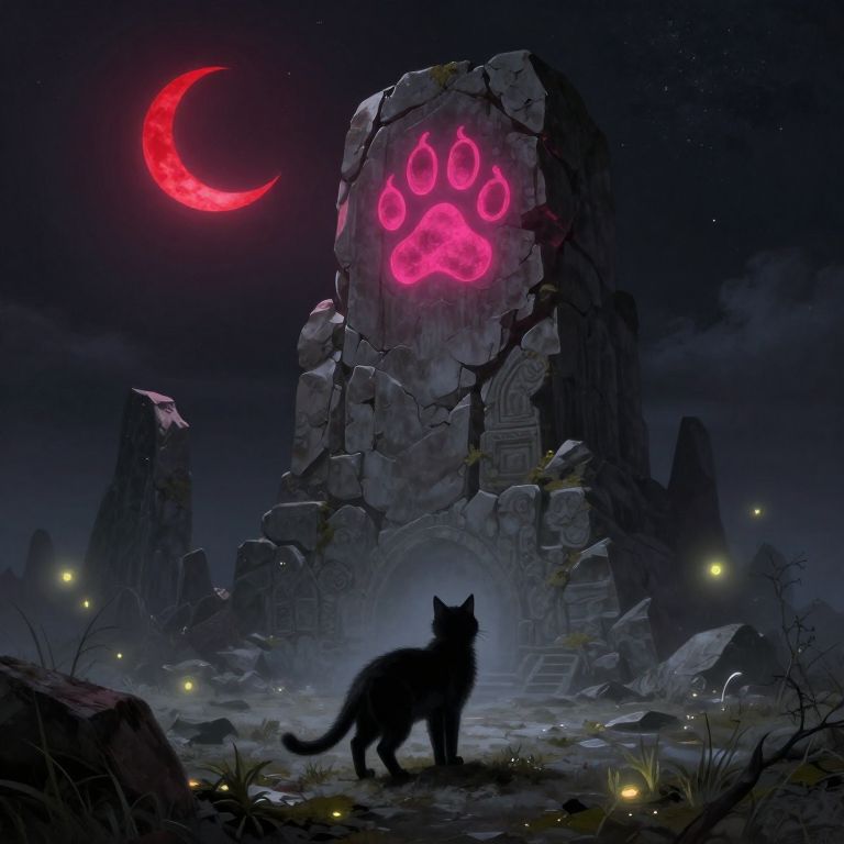 In this digital fantasy artwork, a black cat stands in the foreground, facing an ancient, crumbling stone structure under a starry night sky. The structure, illuminated by a glowing red crescent moon, features a neon pink paw print symbol on its upper section. The moon casts a soft red glow, while scattered fireflies add a touch of light. The stone structure is surrounded by dark, rocky terrain with sparse vegetation. The cat's silhouette contrasts sharply with the dark background, creating a mysterious and eerie atmosphere. The overall color palette includes deep blues and blacks, with striking red and pink accents.